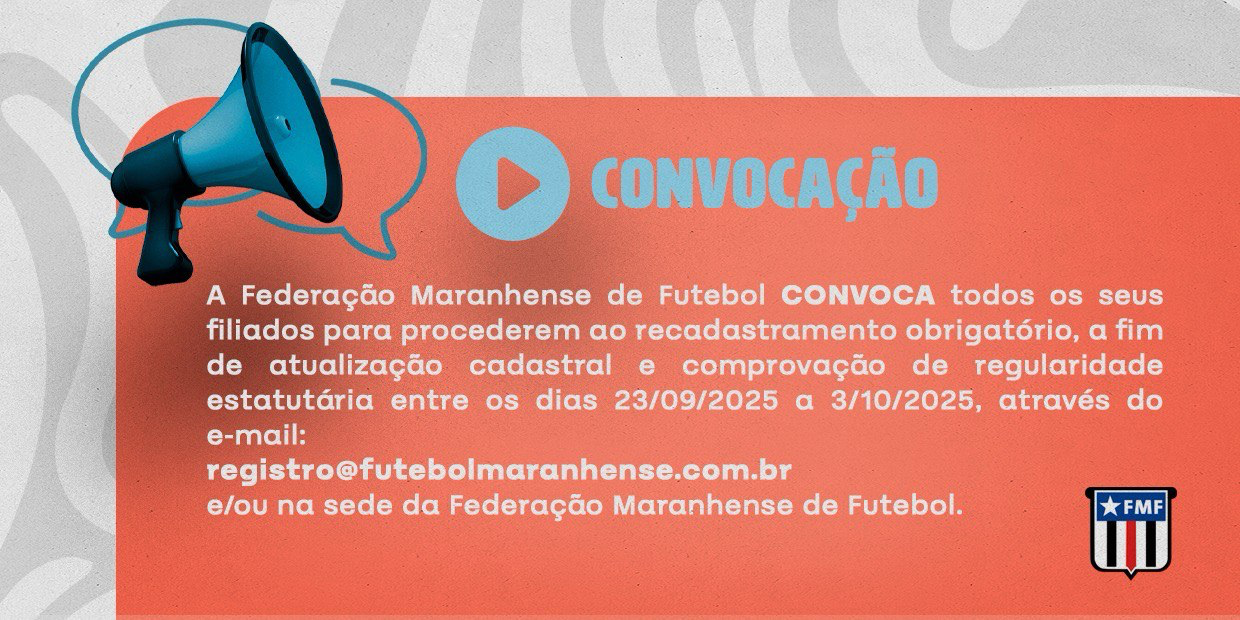 A Federação Maranhense de Futebol (FMF) convoca todos os seus filiados a realizarem o recadastramento obrigatório para atualização cadastral e comprovação de regularidade estatutária.